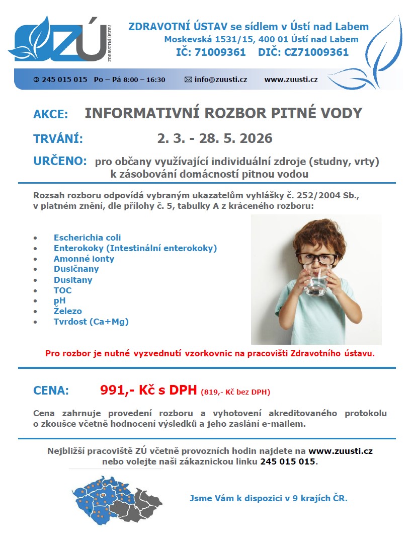 Pokud máte zájem o informaci, jakou kvalitu vody máte ve vlastních zdrojích (studny, vrty), můžete využít tuto nabídku na rozbor vody od Zdravotního Ústavu se sídlem v Ústí nad Labem (zřizovatelem je Ministerstvo Zdravotnictví ČR). Nabízí nyní pro soukromé osoby informativní rozbor vody za cenu – viz. leták.