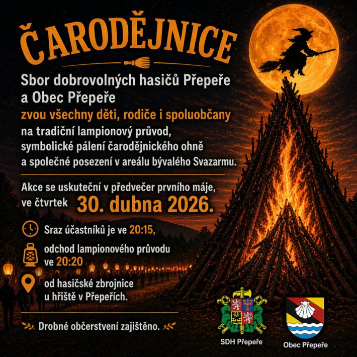 SDH Přepeře a Obec Přepeře zvou všechny děti, rodiče a spoluobčany na tradiční lampiónový průvod, symbolické pálení čarodějnického ohně a společné posezení v areálu bývalého Svazarmu v Přepeřích. Vše se uskuteční v předvečer prvního máje, tedy ve čtvrtek 30. dubna 2026. Sraz účastníků je ve 20:15 a následný odchod lampiónového průvodu ve 20:20 od hasičské zbrojnice u hřiště v Přepeřích. Na Svazarmu bude připraven symbolický čarodějnický oheň a také další menší na opečení buřtů. Připraveno bude i drobné občerstvení. Srdečně Vás zveme.