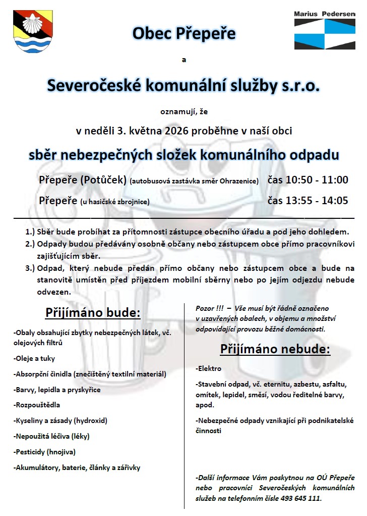 Severočeské komunální služby nás informují, že v neděli 3. května 2025 proběhne v naší obci sběr nebezpečných složek komunálního odpadu. Pojízdná sběrna přijede v 10:50 do Přepeř oblast Potůček na autobusovou zastávku směr Ohrazenice. Dále přijede v 13:55 do Přepeř k hasičské zbrojnici (před OÚ, MŠ). Pojízdná sběrna se na místě zdrží maximálně 10 minut. Vše bude probíhat pod dozorem pracovníka obce. Odpad, který nebude osobně předán pracovníkovi sběrny, nebude ani odvezen. Proto je zakázáno umísťovat odpad na místo, před příjezdem a po odjezdu sběrny.