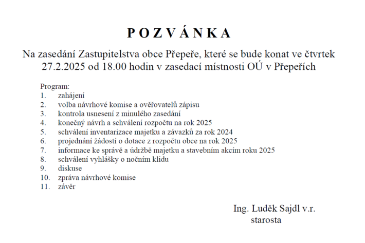 Obecní úřad Přepeře děkuje všem spoluobčanům, že nepoužívají hlučné stroje o státních svátcích a nedělích, a že nepálí větve a nepořádek na svých pozemcích v zastavěné oblasti. Zároveň informujeme, že letos první termín otevřeného složiště větví za Svazarmem, pro vás obyvatele Přepeř, bude v sobotu 15. března 2025 v obvyklém čase tedy od 8:30 do 11:30. Další možnost pak bude 22. března. Připomínáme, že složiště je pod dozorem a je zde možno uložit pouze větve stromů a keřů.