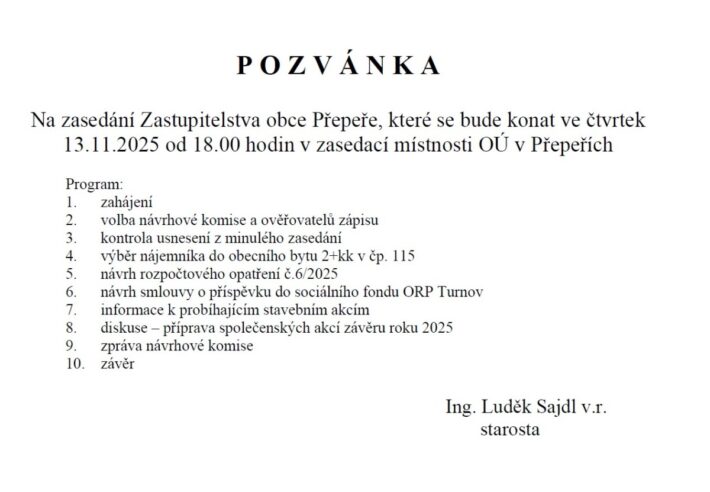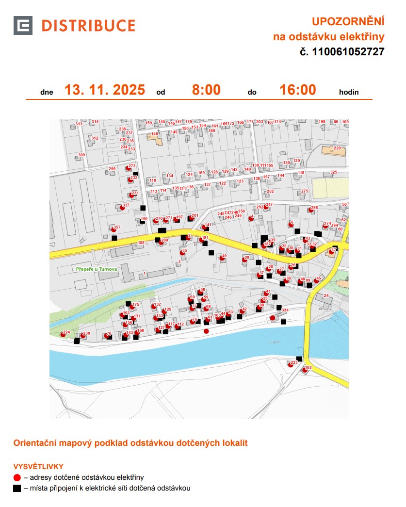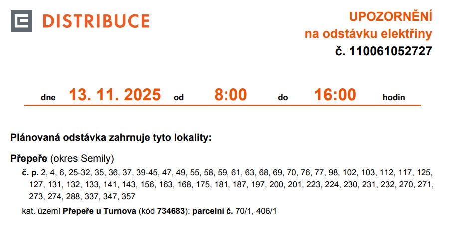 Společnost ČEZ Distribuce a.s. nás informuje o přerušení dodávky elektřiny z důvodu plánovaných prací na zařízení distribuční soustavy v naší obci. Odstávka je plánována na čtvrtek 13. listopadu 2025 v čase od 8:00 do 16:00 a týká se jen části obce Přepeře – lokalita „Závodí“ a nejbližší okolí, dále odběrná místa při silnici II/610 směrem od návsi na Příšovice a část ulice k bytovkám Kolora. Konkrétně: č.p. 2, 4, 6, 25-32, 35, 36, 37, 39-45, 47, 49, 55, 58, 59, 61, 63, 68, 69, 70, 76, 77, 98, 102, 103, 112, 117, 125, 127, 131, 132, 133, 141, 143, 156, 163, 168, 175, 181, 187, 197, 200, 201, 223, 224, 230, 231, 232, 270, 271, 273, 274, 288, 337, 347, 357 + parcelní č. 70/1 a 406/1 – kat. území Přepeře u Turnova (kód 734683). Konkrétní informace naleznete na internetových stránkách obce.