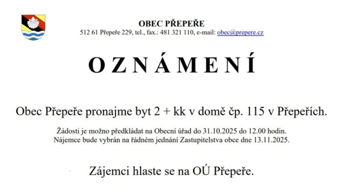 Obec Přepeře oznamuje, že pronajme byt 2+KK v domě čp. 115 v Přepeřích.