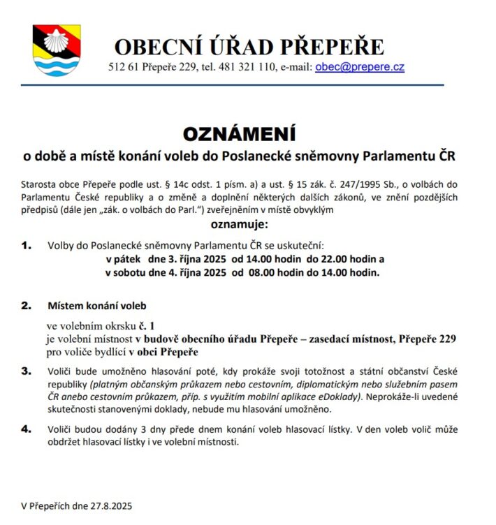 Obecní úřad informuje, že v pátek 3. a v sobotu 4. října 2025 proběhnou v zasedací místnosti obecního úřadu v Přepeřích č.p. 229 volby do Poslanecké sněmovny Parlamentu ČR. Volební lístky Vám budou doručeny v následujících dnech do vašich poštovních schránek, případně budou dostupné na požádání ve volební místnosti. Volební místnost na obecním úřadu v Přepeřích se Vám otevře v pátek 3. října ve 14:00 a uzavře ve 22:00 hodin, dále v sobotu 4. října v 8:00 a uzavře ve 14:00 hodin odpoledne.