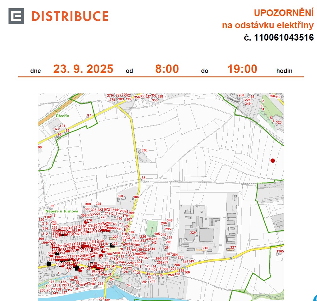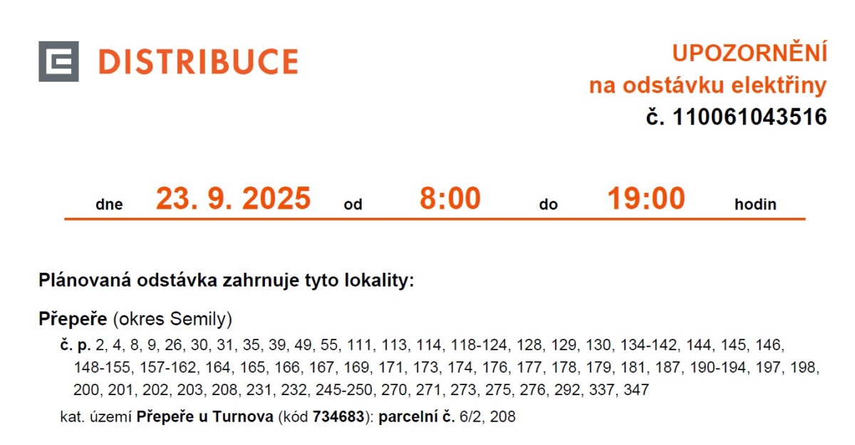 Společnost ČEZ Distribuce a.s. nás informuje o přerušení dodávky elektřiny z důvodu plánovaných prací na zařízení distribuční soustavy v naší obci. Odstávka je plánována na úterý 23. září 2025 v čase od 8:00 do 19:00 a týká se jen části obce Přepeře – I. a II. ulice + lokalita při silnici II/610 od návsi směr Příšovice. Konkrétně: č.p. 2, 4, 8, 9, 26, 30, 31, 35, 39, 49, 55, 111, 113, 114, 118-124, 128, 129, 130, 134-142, 144, 145, 146, 148-155, 157-162, 164, 165, 166, 167, 169, 171, 173, 174, 176, 177, 178, 179, 181, 187, 190-194, 197, 198, 200, 201, 202, 203, 208, 231, 232, 245-250, 270, 271, 273, 275, 276, 292, 337, 347 + kat. území Přepeře u Turnova (kód 734683): parcelní č. 6/2, 208. Konkrétní informace naleznete na internetových stránkách obce.