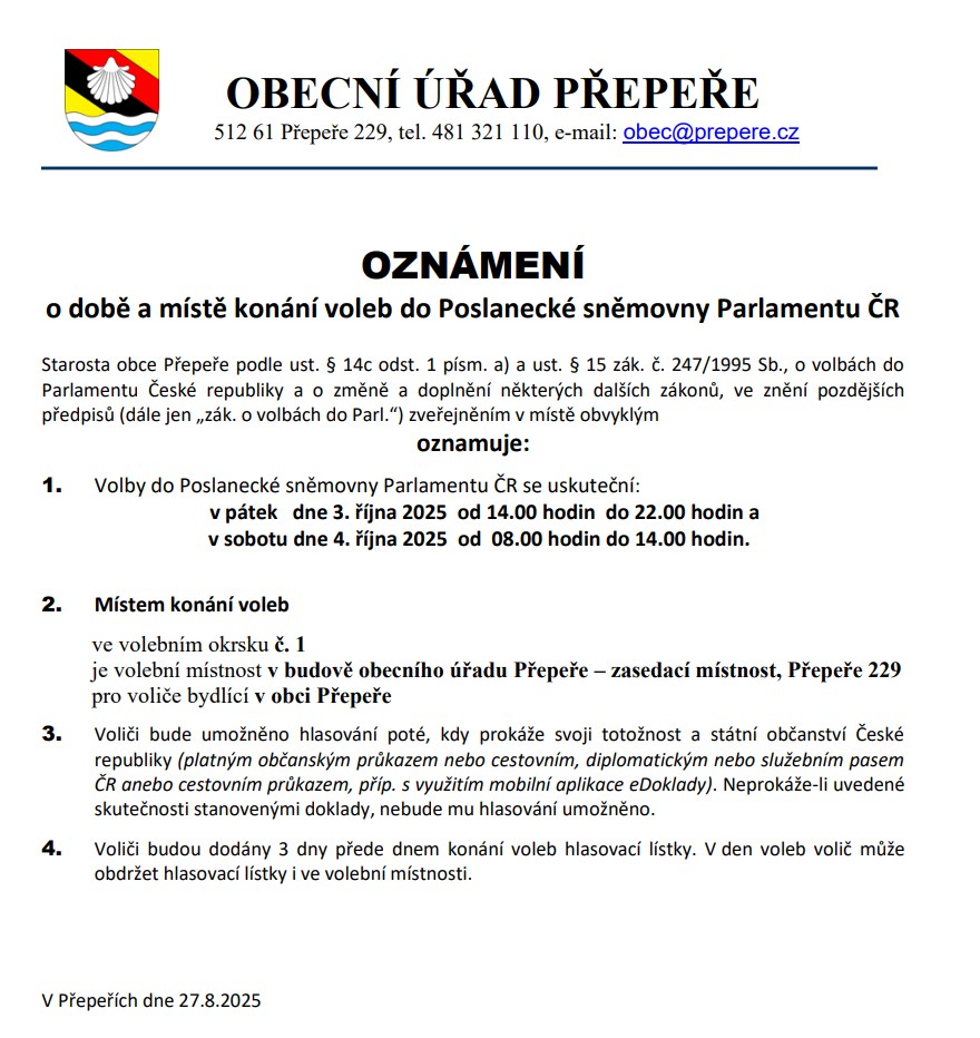 Obecní úřad informuje, že v pátek 3. a v sobotu 4. října 2025 proběhnou v zasedací místnosti obecního úřadu v Přepeřích č.p. 229 volby do Poslanecké sněmovny Parlamentu ČR. Volební lístky Vám budou doručeny v následujících dnech do vašich poštovních schránek, případně budou dostupné na požádání ve volební místnosti. Volební místnost na obecním úřadu v Přepeřích se Vám otevře v pátek 3. října ve 14:00 a uzavře ve 22:00 hodin, dále v sobotu 4. října v 8:00 a uzavře ve 14:00 hodin odpoledne.