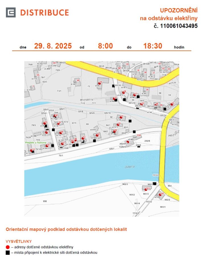 Společnost ČEZ Distribuce a.s. nás informuje o přerušení dodávky elektřiny z důvodu plánovaných prací na zařízení distribuční soustavy v naší obci. Odstávka je plánována na pondělí 11. srpna 2025 v čase od 8:30 do 19:30 a týká se jen části obce Přepeře – část II.ulice blíže u parkoviště u hřbitova + obecní bytovka. Konkrétně: č.p. 46, 64, 65, 66, 67, 71, 81, 109, 115, 116. Konkrétní informace naleznete na internetových stránkách obce.