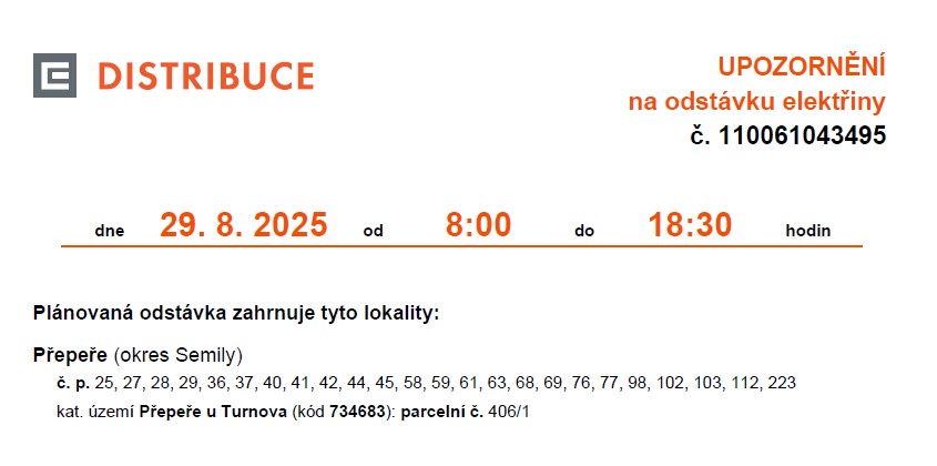 Společnost ČEZ Distribuce a.s. nás informuje o přerušení dodávky elektřiny z důvodu plánovaných prací na zařízení distribuční soustavy v naší obci. Odstávka je plánována na čtvrtek 7. srpna 2025 v čase od 8:00 do 19:00 a týká se jen části obce Přepeře – lokalita „Závodí“ + nejbližší okolí. Konkrétně: č.p. 25, 27, 28, 29, 36, 37, 40, 41, 42, 44, 45, 58, 59, 61, 63, 68, 69, 70, 76, 77, 98, 102, 103, 112, 117, 125, 127, 131, 132, 133, 143, 156, 163, 168, 175, 223, 224, 230 + parcelní č. 70/1, 406/1 – kat. území Přepeře u Turnova (kód 734683).