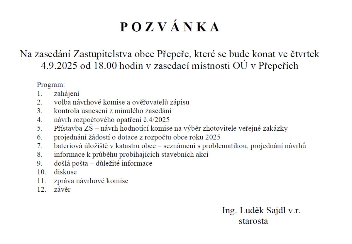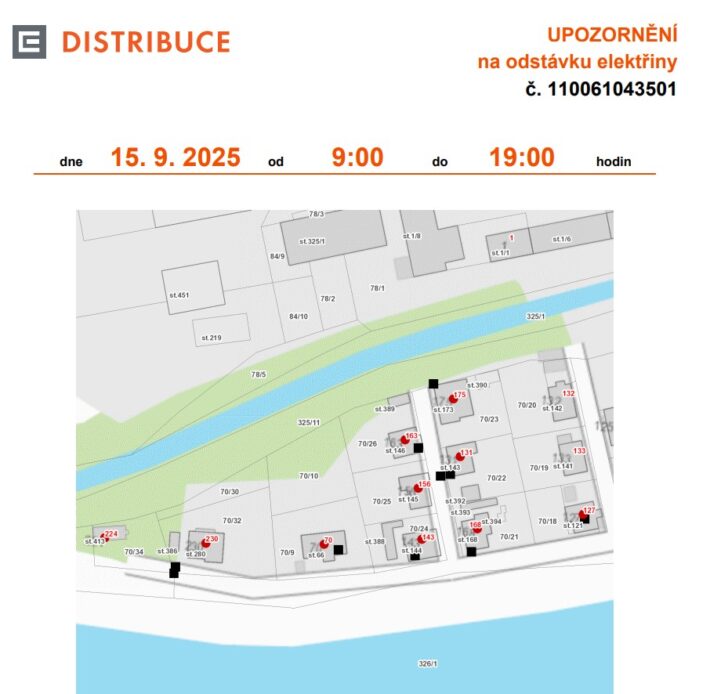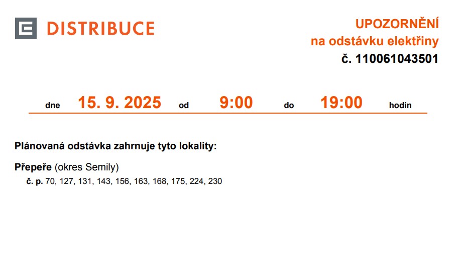 Společnost ČEZ Distribuce a.s. nás informuje o přerušení dodávky elektřiny z důvodu plánovaných prací na zařízení distribuční soustavy v naší obci. Odstávka je plánována na pondělí 15. září 2025 v čase od 9:00 do 19:00 a týká se jen části obce Přepeře – část lokality „Závodí“.