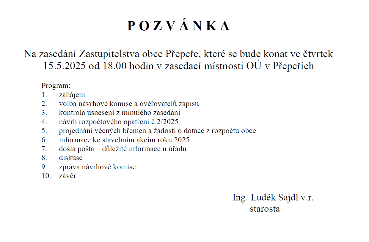 Obecní úřad Přepeře informuje, že další termín otevřeného složiště větví za Svazarmem, pro vás obyvatele Přepeř, bude v sobotu 3. května 2025 v obvyklém čase tedy od 8:30 do 11:30. Připomínáme, že složiště je pod dozorem a je zde možno uložit pouze větve stromů a keřů.